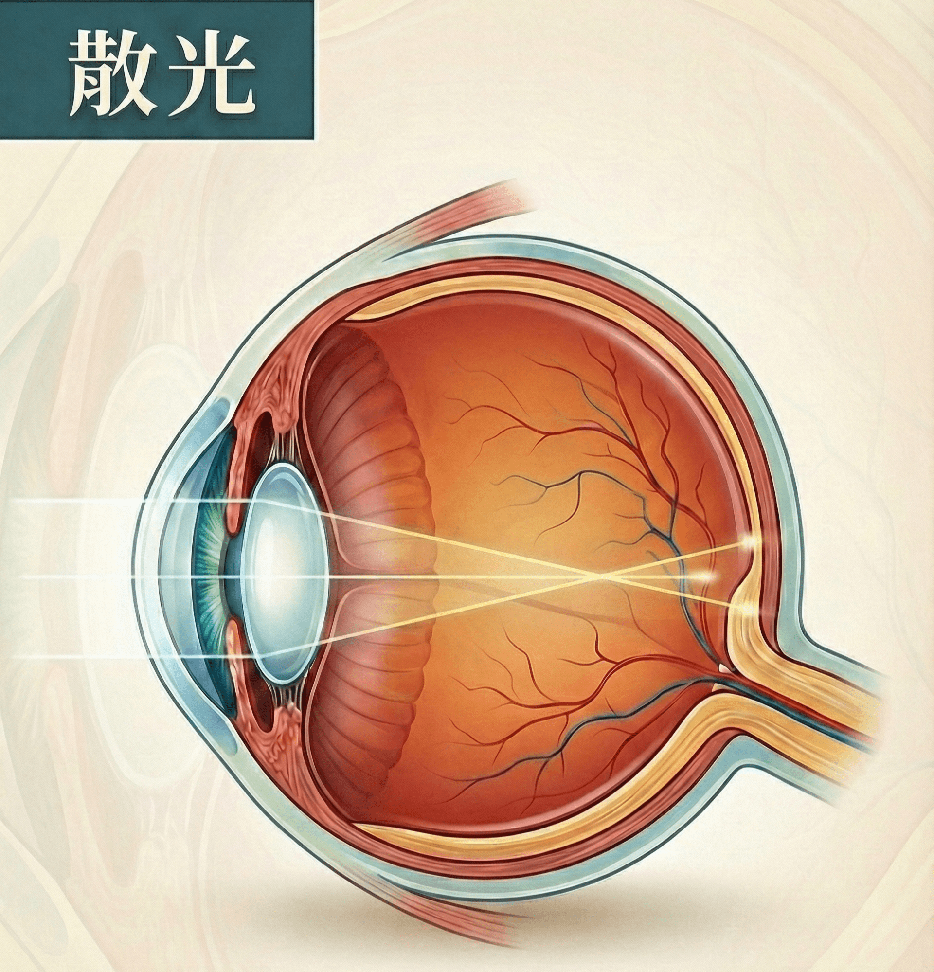 角膜或水晶體弧度不平均, 使光線進入眼睛後無法 集中在單一焦點上,而是形成多個焦點,導致影像模糊或變形。