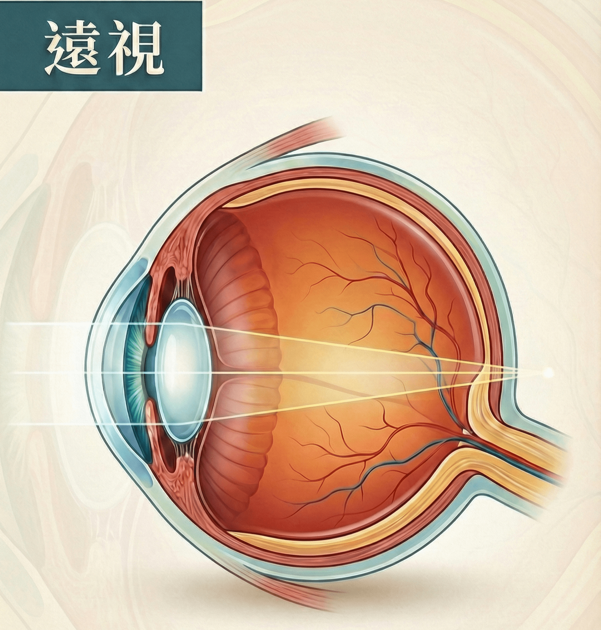主要表現為看遠清楚,看近模糊。因眼球較短,或角膜、水晶體屈光力不足,使影像聚焦於視網膜後方。