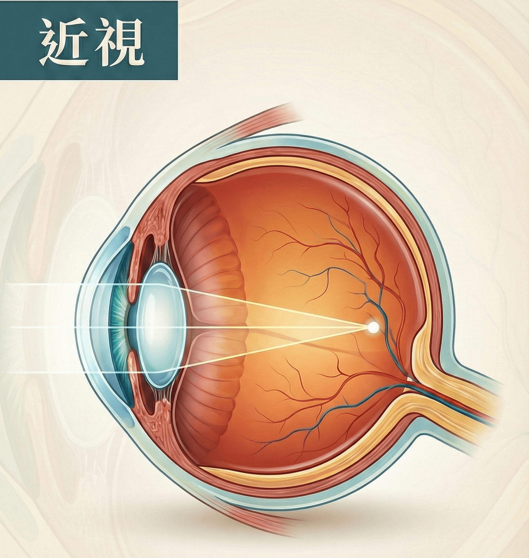 主要表現為看近清楚,看遠模糊。 當光線進入眼睛後,因眼球過長 或角膜、水晶體屈光力過強,使影像聚焦於視網膜前。